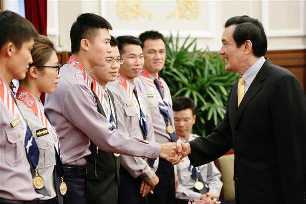 馬英九總統今(16)日上午接見參加「2015年第16屆世界警察消防運動會」中華代表隊,對訪賓為國爭光的傑出表現,表達由衷肯定與祝賀之意。
