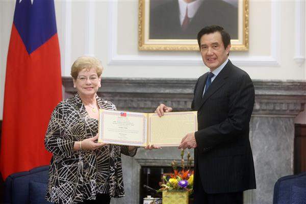 馬英九總統今(27)日下午頒贈「抗戰勝利紀念章」及紀念證書予空軍英雄陳故副大隊長瑞鈿(Arthur Chin),由渠女蘇珊恩尼斯(Susan Eva Ennis)代表接受,以表彰陳瑞鈿少校在抗戰期間保家衛國的卓越貢獻。