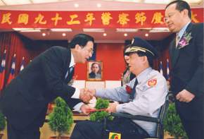 今天欣逢第二十五屆的警察節,在這個特別偉大而溫馨的節日裡,阿扁要代表政府和全體國人同胞,向所有警察同仁表示最誠摯的敬意與由衷的謝忱,感謝各位在工作崗位上的辛勞付出,甚至冒險犯難,來維持社會的秩序與正義,讓各行各業可以安心打拼,沒有後顧之憂。治安的改善絕對得來不易,在警察同仁盡忠職守、認真奉獻的同時,也犧牲許多跟家人正常相處的時間。在此,對所有警察眷屬無私的支持和犧牲,阿扁要特別說一聲謝謝,大家辛苦了!