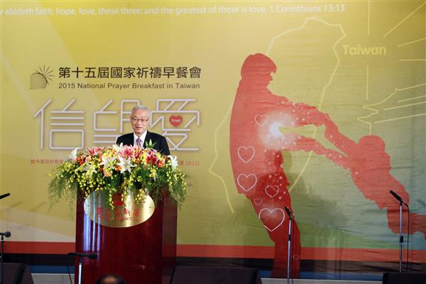吳敦義副總統今(7)日上午代表馬英九總統出席「第15屆國家祈禱早餐會」,期許讓上帝的愛在兩岸領導人的會面中發揮智慧,兩岸能永續和平發展。