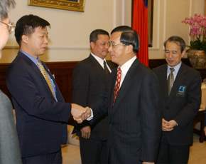 九十年度參與監所教化及保護事業有功人士、團體代表黃映蒲、鄭榮坤、金克斌、潘海清、紀文銘、陳昊、張進吉、妙慧法師,暨新竹榮譽觀護人協進會理事長戴國礎、天主教嘉義教區監獄牧靈服務社理事長黃國峰等人,上午由法務部部長陳定南、台灣更生保護會董事長吳國愛陪同,前來總統府晉見總統。總統府副秘書長陳哲男也在座。