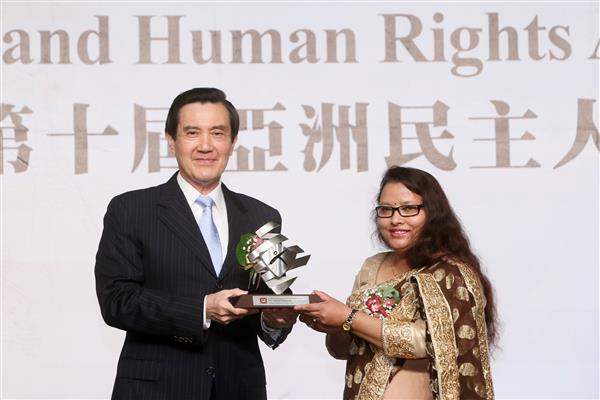 馬英九總統今(10)日上午出席由「臺灣民主基金會」舉辦的「2015年第十屆亞洲民主人權獎」頒獎典禮,親頒獎座予尼泊爾「力量團」(Shakti Samuha)創辦人暨執行長桑妮塔‧達努瓦(Sunita Danuwar),並說明我政府為保障民主與人權所做的努力與具體成果。