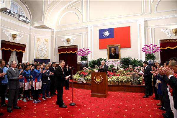 訪賓一行322人由「中華民國慢速壘球協會」理事長陳翔玠陪同,前來總統府拜會副總統,教育部體育署副署長彭臺臨亦在座。