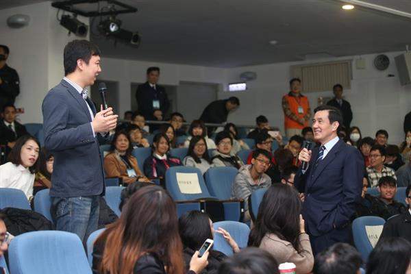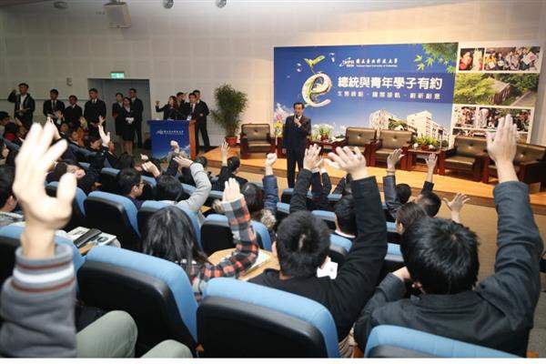 馬英九總統今(18)日上午前往臺北科技大學出席「總統與青年有約」校園座談,說明政府於推動節能減碳及綠能環保之相關政策,並針對同學們所關心之議題,包括我對外關係、陸生納保及外籍生留臺工作等進行回應。