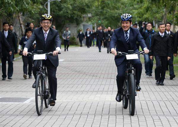 總統首先聽取臺北科技大學校長姚立德介紹該校透水磚設計,隨後在姚校長陪同下,騎乘以電力協助騎乘的「助騎腳踏車」前往教學大樓,並參觀綠能成果展示攤位,以瞭解該校於綠能發明上的各項成果。