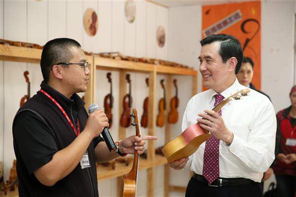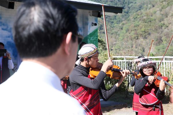 總統抵達親愛部落後首先欣賞親愛愛樂弦樂團演出,對悠揚優美的樂聲留下深刻印象。隨後總統也參觀製琴工作坊,瞭解該村成為小提琴部落的故事及小提琴製程,還試彈烏克麗麗,親身體驗當地精湛的製琴工藝。