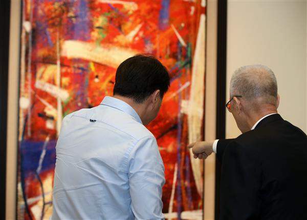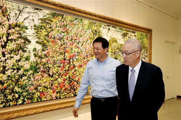副總統由周錫瑋先生親自導覽解說,瞭解每一幅畫作背後的創作故事,他也不時向周先生分享自己無垠無際的想像,流露對其畫作的濃厚興趣。副總統對周錫瑋先生自學而來的繪畫功力讚嘆不已,更以「周大師」稱呼,表達對其作品的敬佩之意。