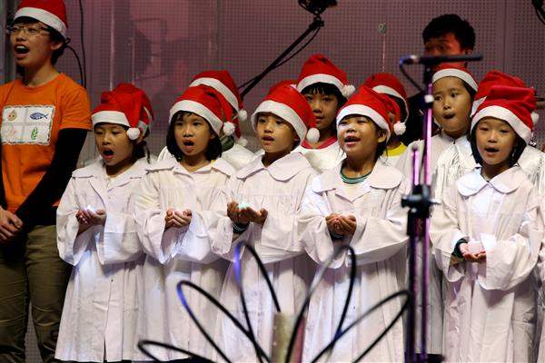 馬英九總統今(24)日晚間前往臺中市旌旗教會出席「2015和好、疼惜、平安夜」報佳音活動,與臺中地區的教友及「臺中沐風關懷協會」的小朋友們,在悠揚的聖誕樂音與牧師分享的聖誕信息中,共度溫馨的平安夜。