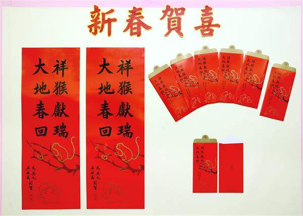 總統府表示,猴年春聯及紅包袋上印有總統親筆揮毫的「祥猴獻瑞 大地春回」賀詞,並由總統與副總統共同署名。圖樣設計是以臺灣獼猴為發想,以「猴捧仙桃」象徵經濟繁榮、大地迎春;下方大猴帶著小猴,傳遞生生不息的新年氣象。此外,今年紅包袋的封口採用插槽式設計,則有財源廣進、人民百業興旺、國家富足豐饒之意。