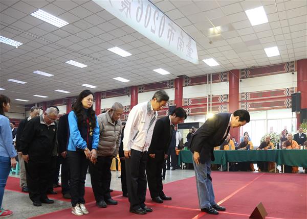 隨後,總統轉往臺南市殯儀館至地震罹難者頭七法會靈前致祭,並由行政院長張善政及臺南市賴市長陪同,逐一向家屬握手致意。總統並於聽取家屬請求後低聲撫慰,現場氣氛肅穆哀戚。