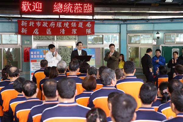 馬英九總統今(19)日上午赴新北市慰勉新店區清潔隊年節留守同仁,除感謝所有清潔隊員們對於維護環境整潔的付出與犧牲,也說明政府近年來推動垃圾減量及資源回收的相關措施及成效。