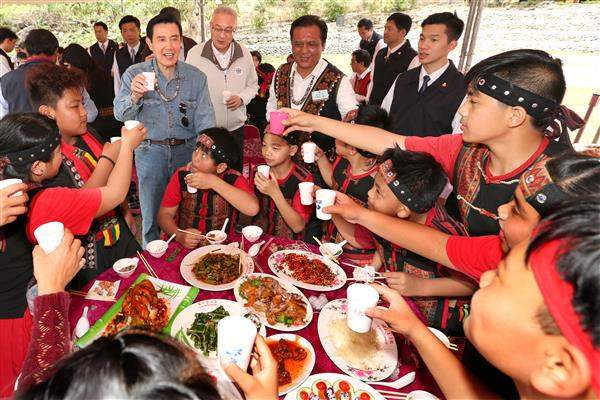 之後,總統、副總統與頭目代表等鄉親一同祈禱與用餐,並共飲連杯酒,祝福部落一切平安,現場氣氛熱絡溫馨。