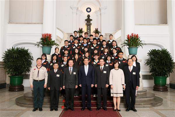 得獎代表一行由保德信青少年基金會董事長黃大洲率領,總統府資政、中華民國童軍文教基金會董事長趙守博、教育部次長林思伶陪同,前來總統府晉見總統,總統府副秘書長熊光華也在座。