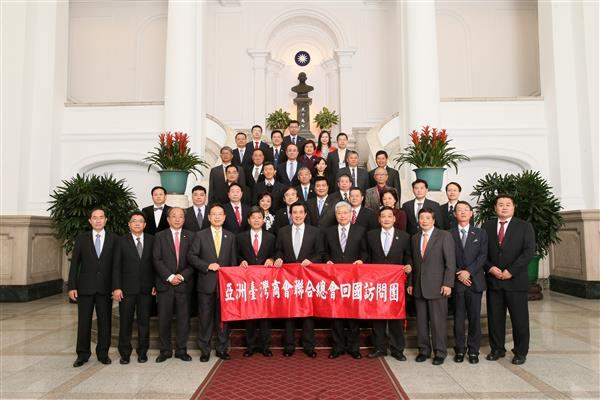 馬英九總統今(30)日下午接見「亞洲臺灣商會聯合總會回國訪問團」,除感謝渠等熱心公益及促進我國經濟發展的卓越貢獻,並說明政府近年來促進經濟成長及貿易自由化的成果。
