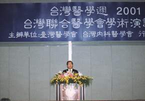 記得去年醫師節本人曾說過,台灣醫學會是結合台灣醫界菁英的第一個本土醫學會,多年來,貴會不但推動台灣的醫學研究,推展台灣的醫學教育,並促進台灣醫療現代化到達世界水準。走過二十世紀,台灣醫學會對台灣醫學界的貢獻已廣受各界肯定。然而,我們追求卓越的腳步仍將繼續前進。近來發生在全球各地的許多災難,不管是天然的或是人為的,對人類的生命和健康都構成前所未有的威脅,也使得醫療保健的議題變得更具挑戰性。身為地球村的一份子,我們必須積極與其他國家相互學習與合作,共同致力疾病的預防和治療。希望台灣醫學會能秉承過去對這塊土地的關懷,帶領國內醫界積極地走入世界醫療社會。