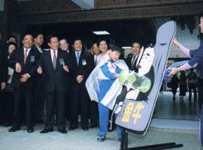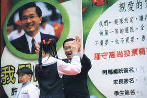 陳總統水扁先生今天上午前往台北縣板橋市後埔國小參加「和阿扁總統擊掌約定反賄選」活動,除親自簽署反賄選聲明外,並與同學們擊掌約定反賄選,高呼「堅持反賄選,大家一起來」。