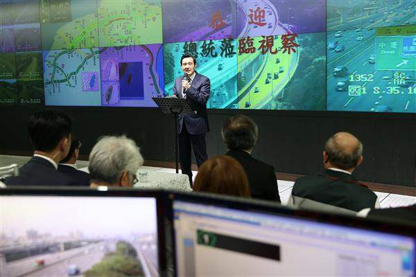 之後,總統步行前往交通部高公局北區交控中心視察,先聽取該局副局長吳木富交通管理簡報,隨後致詞表示,該局在交通管理的推動及提供用路人智慧化的道路環境上,精益求精、持續進步;在電子收費方面,更創下了3項世界第一:我國是第一個把整個高速公路系統路網,全面採用電子收費的國家,也是第一個把實施多年的傳統柵欄式人工計次收費系統,成功地全面轉換成無柵欄電子計程收費的國家;此外,我國電子計程收費路網的總長度達到926公里,目前也是世界第一。相信只要有心,定能讓所有工作成果發揮世界級的水準,也讓「臺灣」因同仁的努力躍登國際舞臺。