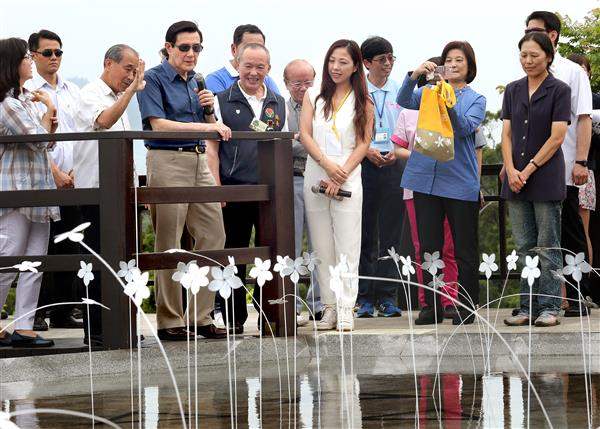 隨後,總統與現場嘉賓一起將油桐花瓣掛在油桐樹上,啟動「庄點花漾:2016客家桐花祭」活動,並步行前往苗栗客家園區後方半月池,欣賞園區美景與以桐花創作的地景藝術。