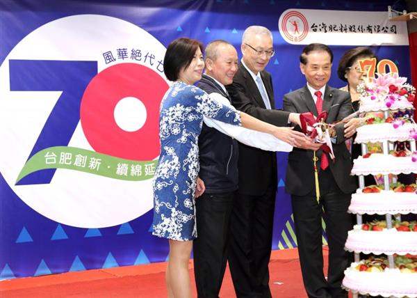 隨後,副總統與苗栗縣長徐耀昌、「臺灣肥料公司」董事長李復興及總統府國策顧問蔡鈴蘭等人共同切蛋糕,祝福「臺灣肥料公司」70週年生日快樂。