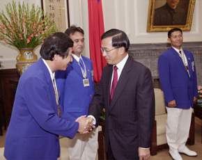 我也了解,在這次賽會期間,中華代表隊堅持我國國旗在選手村及頒獎典禮會場上升起飄揚,十分的不容易,為漂亮的運動戰績更添上光榮。台灣的國際處境雖然艱難,但是不能畏懼,因此,非官方外交途徑的多元外交、全民外交,更能給予重要的協助,所以,阿扁要感謝王理事長以及代表隊,不但拚體育,也拚外交,國家固然以各位為榮、為傲,很高興,各位也以國家為榮、為傲。