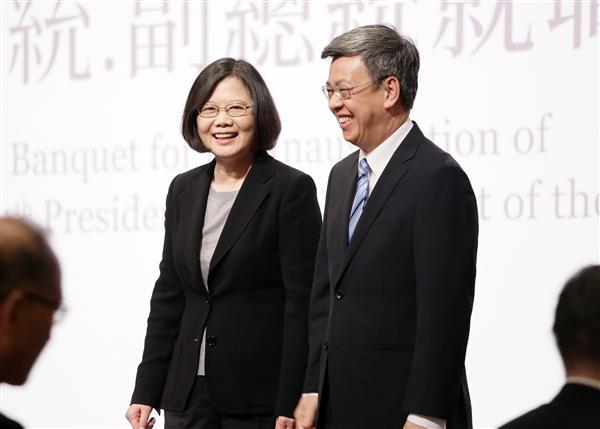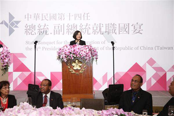蔡英文總統今(20)日晚間在臺北萬豪酒店以國宴款待專程來臺參加我國第14任總統、副總統宣誓就職典禮及慶祝活動的各國貴賓,歡迎並感謝貴賓們不辭千里到訪,並舉杯祝福大家身體健康、友誼長存。