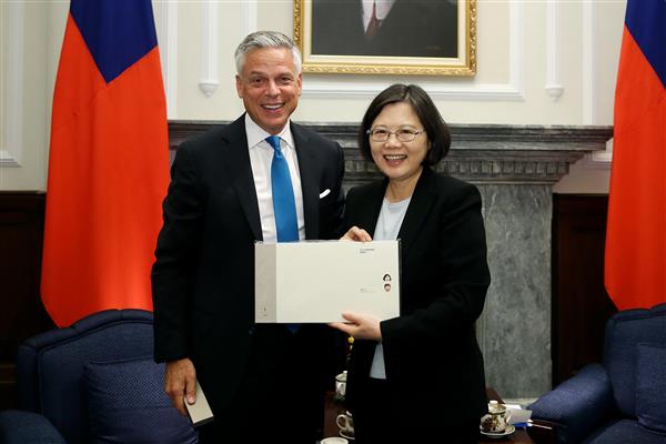 總統致詞時表示,她於去(2015)年5月曾和洪博培(Ambassador Jon Huntsman)大使會面,很高興事隔一年後,能再次與其見面,也感謝洪大使在她就職總統時,特別來函祝賀以及肯定臺灣的民主成就。