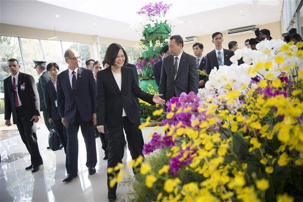 結束「飼料生產計畫」工廠參訪行程後,訪團一行轉往「蘭花產業發展計畫」之展銷中心。蔡總統抵達後,首先接受當地小朋友獻花,並觀賞巴國傳統舞蹈表演。隨後,蔡總統偕我國家安全會議秘書長吳釗燮、外交部長李大維、駐巴拉圭大使俞大㵢及巴國農牧部長巴魯哈(Juan Carlos Baruja)共同為該中心揭牌啟用。續由「蘭花產業發展計畫」計畫經理宮濟平引導蔡總統一行進入中心參觀,實地瞭解該國蘭花產業發展現況及願景。