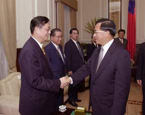 總統說,誠如今天報紙所載,他一直期待兩岸領導人有握手和解的一天,一年來,此一信念也始終如一,沒有改變,他盼望兩岸能秉持「善意的和解、積極的合作及永久的和平」進行對話與協商,如此的用心及苦心,雖然至今仍未獲得對岸善意的回應,但他仍不改初衷。