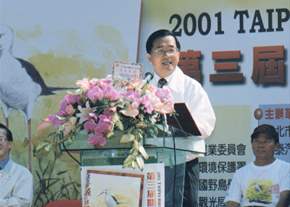 關渡國際賞鳥博覽會是一個結合政府資源、企業贊助及非營利組織力量,眾志成城的盛會。本人首先要恭喜「關渡自然公園」在台北市政府及台北市野鳥學會多年辛勤的努力下,終於成功的開園,將台北人對自然保育用心的成果呈現給國人同胞。關渡自然公園這片五十七公頃的自然溼地,是阿扁擔任台北市市長時,在全體市民對自然保育的殷切關注及市議會全體議員支持下,徵收成立的,這是全國第一座溼地自然公園,更是世界上少數位於都會區的溼地自然公園,當時所需經費大約要新台幣一百五十億元,有人說這花費相當高,平均欣賞一隻鳥,必需花將近十億元,花這麼高的代價是否值得,但事實證明我們的眼光和想法是正確的。台灣因為有十五種特有種鳥類,被「國際鳥盟」編列為全世界序號第一百四十九號的「特有種野鳥棲地」;而關渡自然公園更因豐富而多樣的溼地生態,歷年鳥類紀錄高達二百九十三種,被「國際鳥盟」列入編號 TW○○三號的「台灣重要野鳥棲地」。