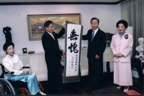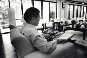總統府公共事務室今天公布陳總統水扁先生新書《世紀首航—政黨輪替五百天的沈思》中三張珍貴照片。第一張是總統在官邸會客室兼客廳翻閱《柯林頓的時代》一書,感受「新中間路線」的行進方向。第二張是二○○一年七月,韓國前大統領金泳三致贈總統「無愧」親筆書法一幅;金前大統領是一九九二年中韓斷交後,也是三十八年來韓國第一位總統級的訪華政要。最後一張則為總統與宜蘭土狗「勇哥」的合照;其實,第一家庭今年的首位正式新成員不是趙建銘,而是「勇哥」,「勇哥」活力充沛,總統每天回家都要陪牠跑上二十分鐘。