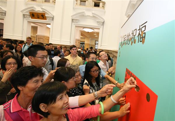 隨後,高齡80歲、在總統府擔任志工長達15年的陳萬益老師;在總統府工作數十載、退休後又回府擔任志工的沈小成先生;新住民之女、今年才剛升大一的陳金鈴同學,以及從小英志工變為總統府志工的鄭谷苑老師也分別與在場民眾分享他們從事志工服務的心得,以及對總統府的深厚情感。而在秘書長的歡迎下,參觀民眾也將代表人民的金色圓點貼紙貼到活動看板上,象徵人民走進總統府,也留下對總統府的期盼與祝福。