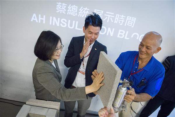 在聽取春池玻璃公司董事長特助吳廷安簡介「資源再生綠色產品」後,總統致詞表示,剛剛看到春池玻璃工廠回收玻璃與廢棄物、再製成防火建材等情形,以及親身體驗該工廠所研發「發泡輕質節能磚」的隔音與隔熱效果,令她大開眼界,也深受感動。