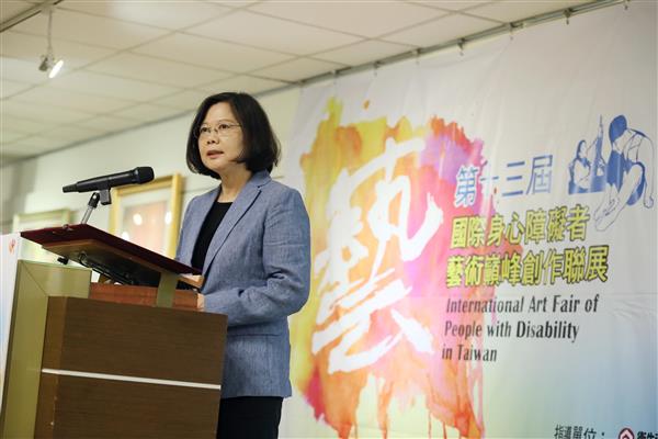 蔡英文總統今(23)日上午前往國父紀念館出席「第十三屆身心障礙者藝術巔峰創作聯展」,肯定參展人克服自身障礙,創造藝術巔峰,並期勉政府與民間共同努力,打造友善無障礙的社會,協助所有身心障礙朋友能夠跨越障礙,在各個領域發光發熱,揮灑精采人生。