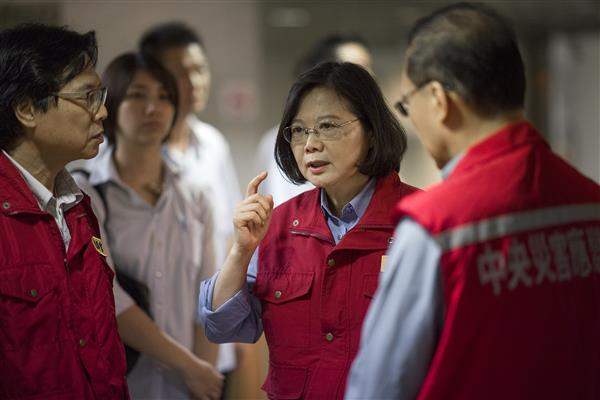 總統指出,颱風期間風強雨大,但仍然有很多防救災的第一線工作人員,像是警消同仁、臺水、臺電,或是負責大眾運輸的臺鐵、高鐵的應變人員,以及國軍弟兄,在外為大家辛勞。不管是處在待命狀態,或是已經出勤搶修、救災,各位的辛苦,她與林全院長、中央災害應變中心指揮官及全體首長都有看見,也特別慰勉同仁們的辛勞。