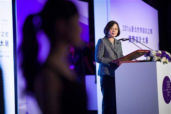 總統致詞表示,今日是「國際設計大展」開幕日,臺北市成為2016年「世界設計之都」,從申辦、獲選到今日大展,過程中不僅有中央、地方政府跟民間單位的攜手合作,還有超過100位國內外設計師的參與,值得肯定。