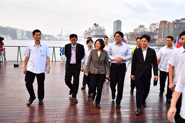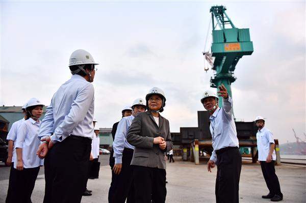 蔡英文總統今(27)日下午在總統府副秘書長姚人多及基隆市長林右昌陪同下,先後前往基隆海洋廣場及台船基隆廠訪視,並至「天顯宮」參拜。