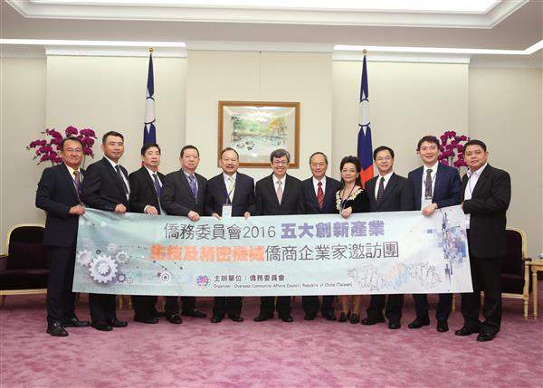 陳建仁副總統今(23)日上午接見「2016年五大創新產業-生技及精密機械僑商企業家邀訪團」,歡迎來自美國、菲律賓、越南、紐西蘭、印尼及馬來西亞等多國僑商來訪,也邀請企業家們共同參與國內創新產業發展,讓臺灣經濟走出新路。