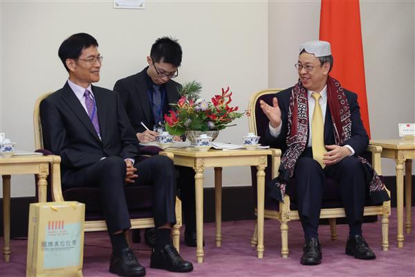 訪賓一行由國立彰化高中圖書館主任呂興忠陪同,前來總統府拜會副總統,外交部次長侯清山亦在座。