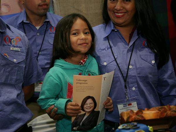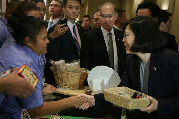 稍早,總統參觀技術合作計畫與「一鄉鎮一特產」成果展,由國合會首席計畫經理王增瑞介紹臺宏技術合作計畫成果,包括「馬鈴薯健康種薯繁殖計畫」及「酪梨健康種苗繁殖計畫」,接著由宏國OTOP計畫總協調人巴朗嘉(Selvin Barralaga)及相關合作單位向總統逐一介紹宏國特色工藝品。參展單位也熱情地為總統配戴精緻的蛋白石項鍊,也致贈總統繪有臺北101及宏都拉斯總統府圖案的皮革手繪包,現場氣氛輕鬆熱鬧。