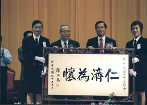 今天,阿扁是特別為了感謝一貫道的道親,長期以來深入台灣社會默默從事公益慈善的奉獻。一貫道這幾年來,設立慈善機構、設置醫療急難救助金、社會福利救濟、賑災救助等善舉,而近來有目共睹的事蹟是,在九二一震災、桃芝及納莉颱風侵襲台灣遭受重創時,一貫道的道親,無私無我地深入災區,展開救援、救濟、重建的工作。因此,阿扁欲藉此賑災表揚大會,感念諸多道親的這份奉獻,特別贈送中華民國一貫道總會四個字——「仁濟為懷」,以表彰弘道濟世之精神。