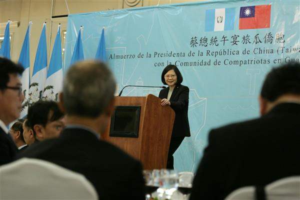 總統致詞時表示,很高興能在瓜地馬拉與僑胞朋友們見面,在這兩天的訪問中,她感受到瓜國政府熱忱的接待,與莫拉雷斯總統有許多互動,並接受他頒贈的「元首國鳥勳章」,稍早她也在瓜地馬拉的國會發表演說。 能有這些外交成果,她除感謝大使館全體同仁的努力,更要感謝國合會的工作夥伴,以及僑界先進長期的耕耘。 這些耕耘,包括臺商累計超過1億美元的投資,在營建業、製造業、食品加工及進出口貿易,為瓜地馬拉創造了許多就業機會,也帶動了經濟成長。