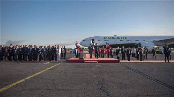 專機停妥後,我駐薩爾瓦多大使謝妙宏與薩國外交部禮賓司長登機迎接蔡總統。薩國外長馬丁內斯(Hugo Martínez)迎於機梯前,並陪同蔡總統沿紅地毯緩步前進接受禮兵致敬。