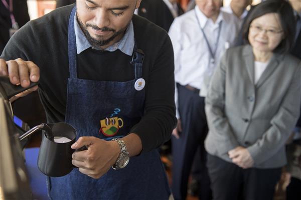 杯測完畢後,總統一行返回簡報室,觀賞世界冠軍咖啡沖調師曼德斯(Alejandro Méndez)現場示範咖啡的磨豆、沖泡、打奶泡及拉花等過程,也現場品嚐香濃美味的咖啡。