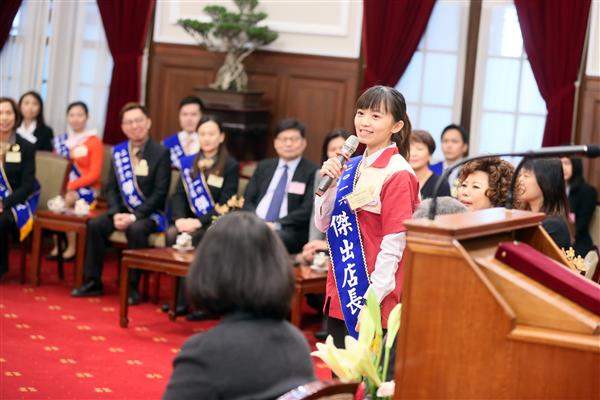 總統說,獲獎店長分別來自房仲、電信、餐飲、便利商店及旅行社等等的領域,每一位都是臺灣企業門市的靈魂人物。她也期待,未來連鎖加盟業能扮演引領前進的角色,以優良的服務態度、卓越的經營管理,以及創新精神,讓臺灣更加進步。