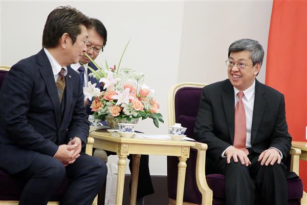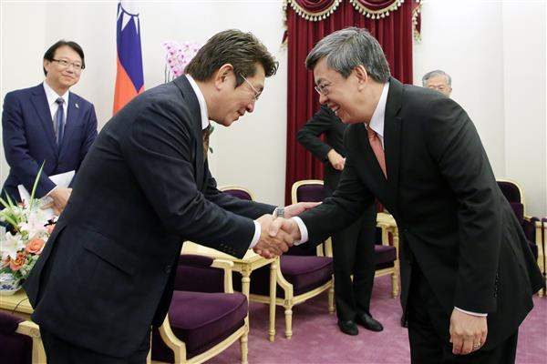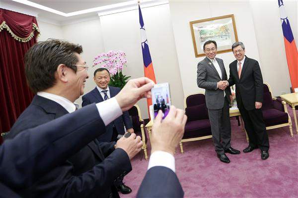 訪賓一行由日本「亞東親善協會」會長大江康弘陪同,前來總統府拜會副總統,外交部次長李澄然及亞東關係協會秘書長蔡明耀均在座。