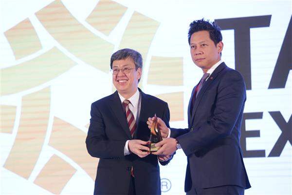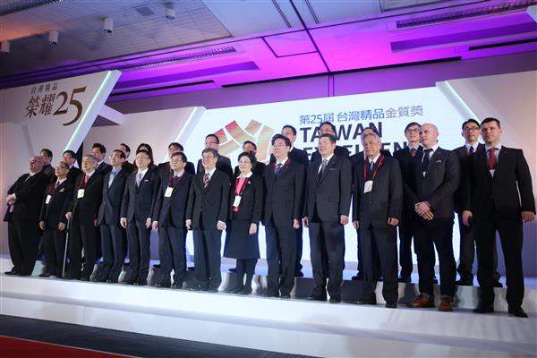 隨後,副總統親頒「臺灣精品金質獎」予大銀微系統股份有限公司、元太科技工業股份有限公司、巨大機械工業股份有限公司、宏碁股份有限公司、美利達工業股份有限公司、茂森科技股份有限公司、晉弘科技股份有限公司、園展科技股份有限公司、群創光電股份有限公司及慶鴻機電工業股份有限公司等十大獲獎企業。