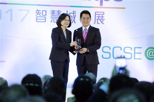 隨後,總統也親自逐一頒發「智慧城市創新應用獎」予14個獲獎團體代表,並進行「2017智慧城市展」的開幕剪綵儀式。
