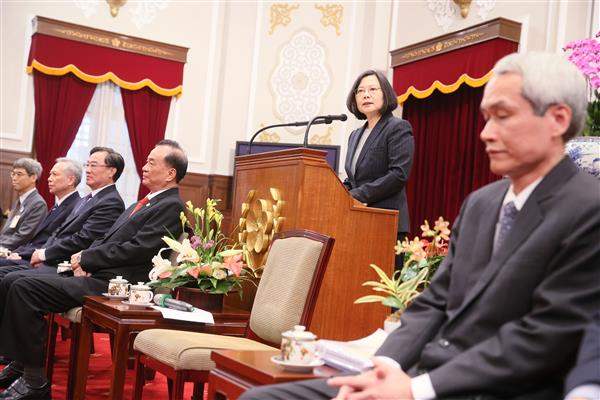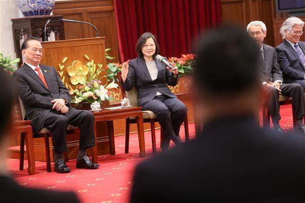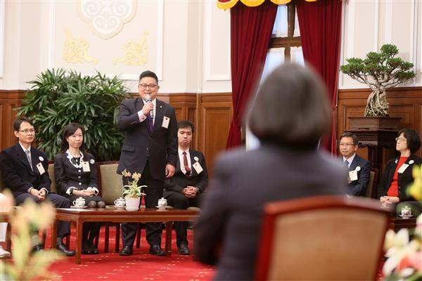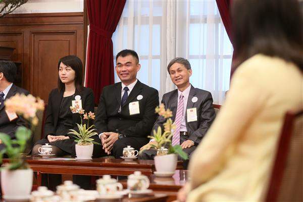 105年度全國模範公務人員代表一行,上午由考試院長伍錦霖、行政院政務委員許璋瑤、考試院秘書長李繼玄、銓敍部長周弘憲,以及行政院人事行政總處人事長施能傑等陪同,前來總統府晉見總統。