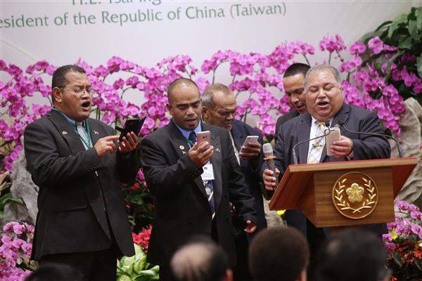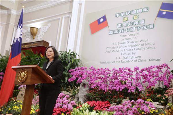 蔡英文總統今(7)日晚間偕同陳建仁副總統在總統府以國宴款待諾魯共和國總統瓦卡(Baron Divavesi Waqa)伉儷暨訪問團成員,期盼臺諾兩國能夠在互惠互助的精神下,深化合作,共創未來,瓦卡總統現場也以中、英文高歌一曲「朋友」,象徵兩國友誼堅定、長久。
