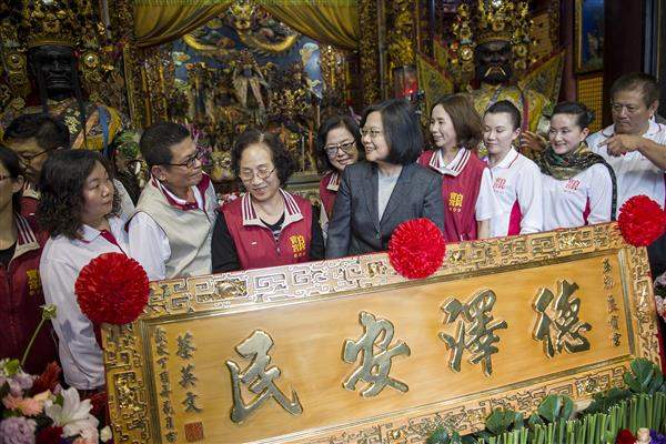 稍早,總統在立法委員陳其邁、陳亭妃、黃偉哲、林俊憲及王定宇等人的陪同下,前往臺南市「良寶宮」上香參拜,祈求神明庇佑臺灣,並頒贈「德澤安民」匾額。